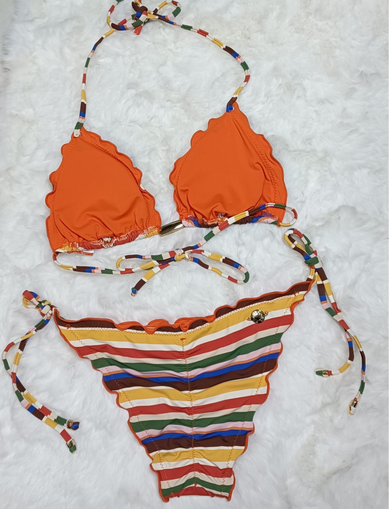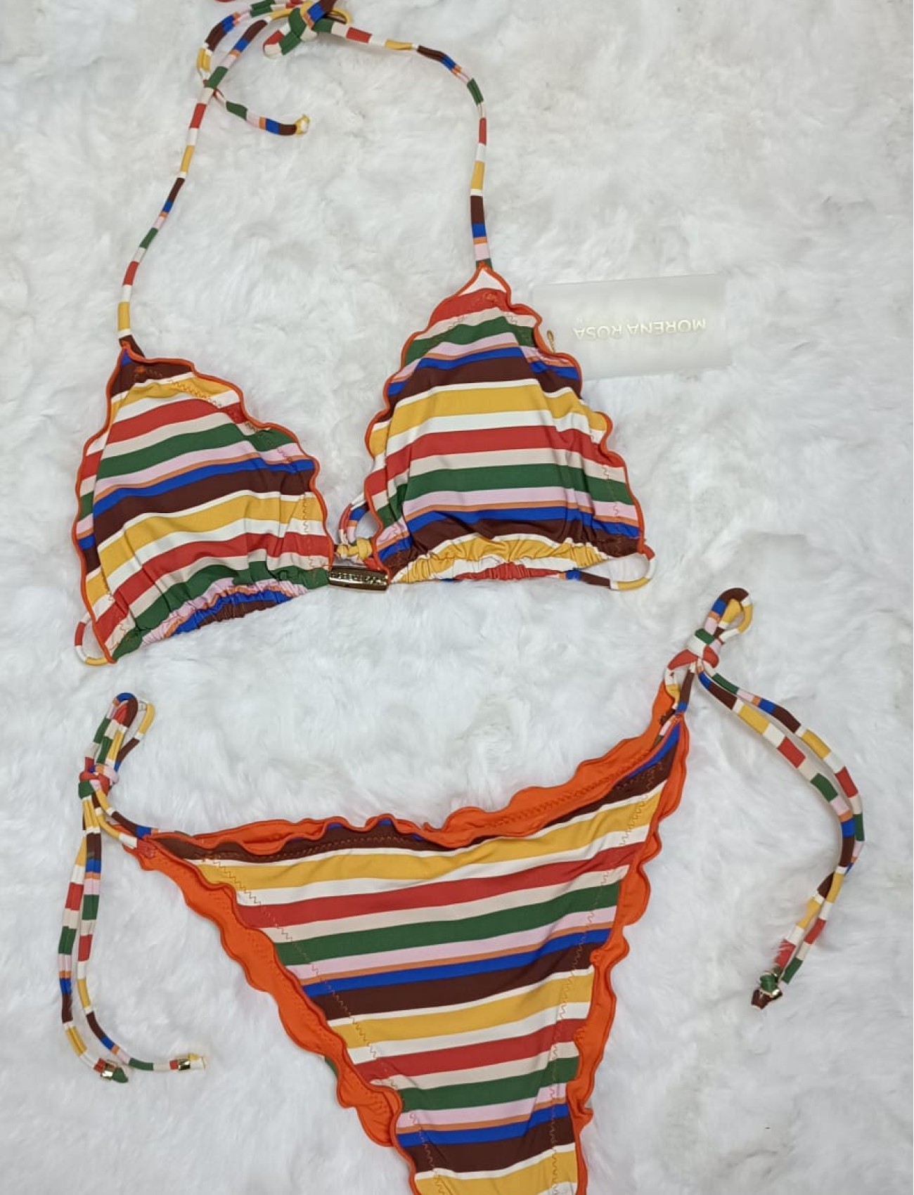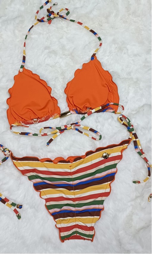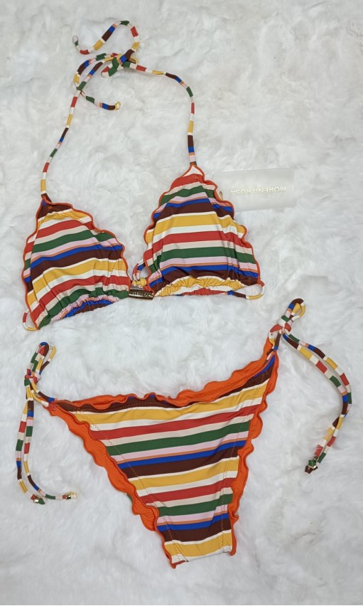 O Biquíni Cortininha com Ponteiras Morena Rosa é a tradução do charme e da alegria do verão. Com estampa listrada multicolorida, o modelo aposta em cores vibrantes e acabamento ondulado, que valorizam o visual com um toque moderno e delicado.