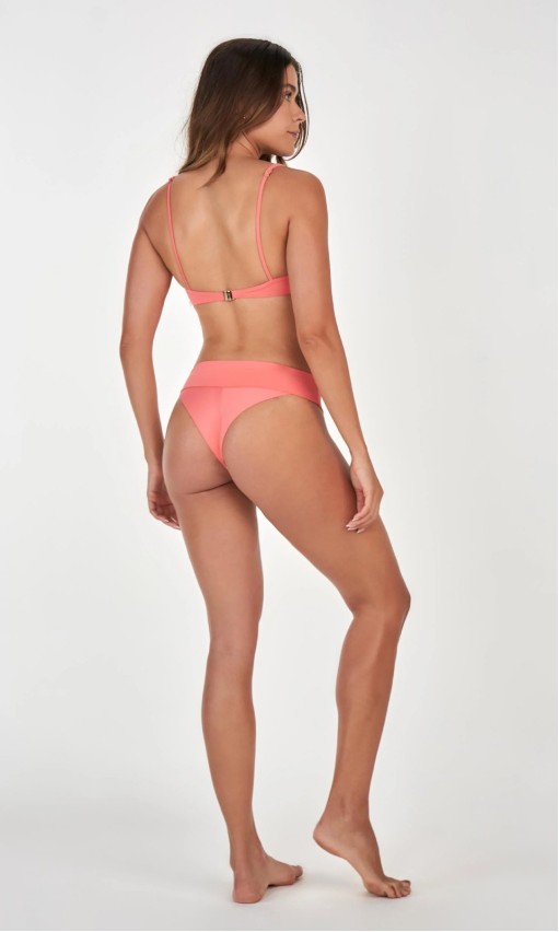 A tanga em cor lisa complementa o conjunto com caimento perfeito e acabamento macio, garantindo liberdade de movimento e um visual harmonioso. Ideal para quem busca um look de praia refinado e cheio de estilo.
