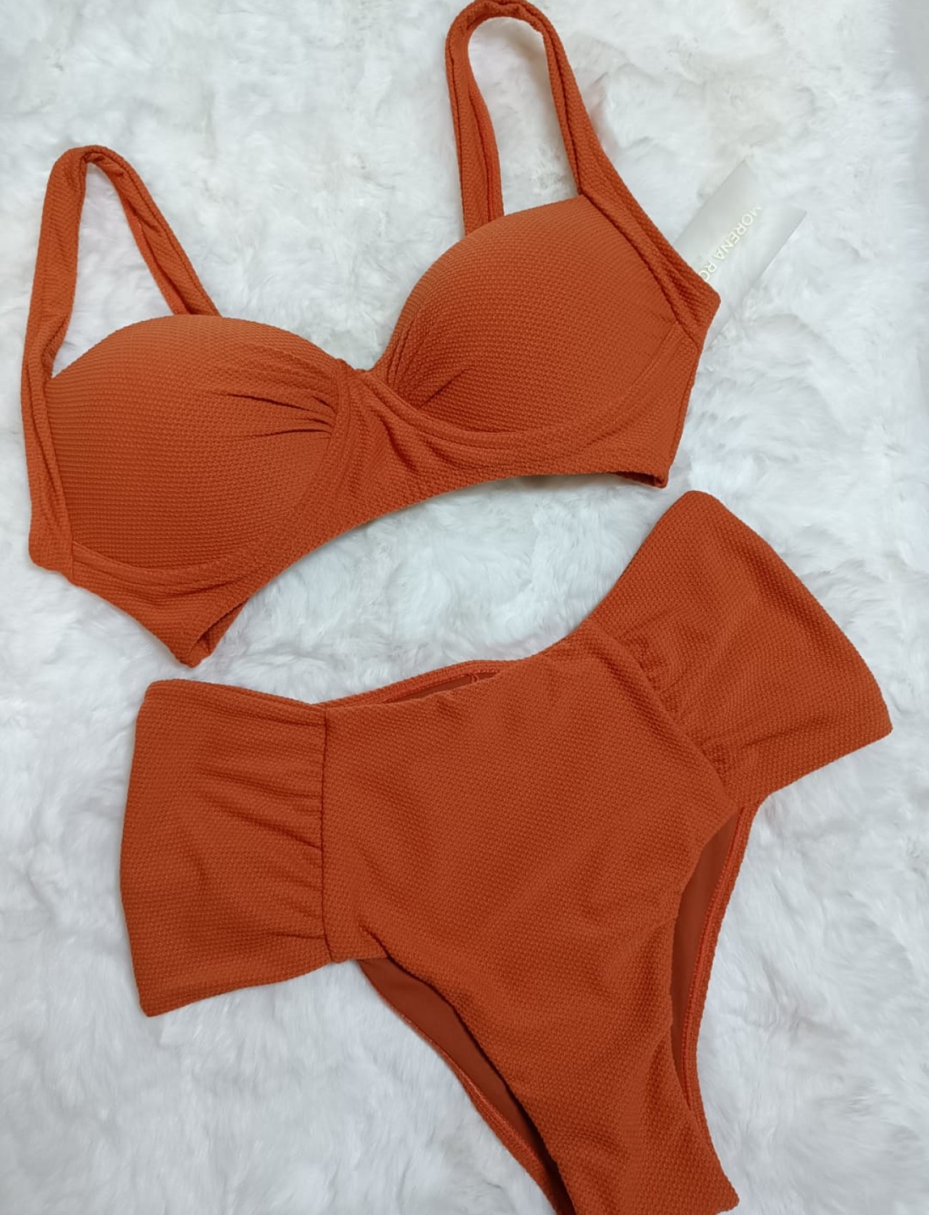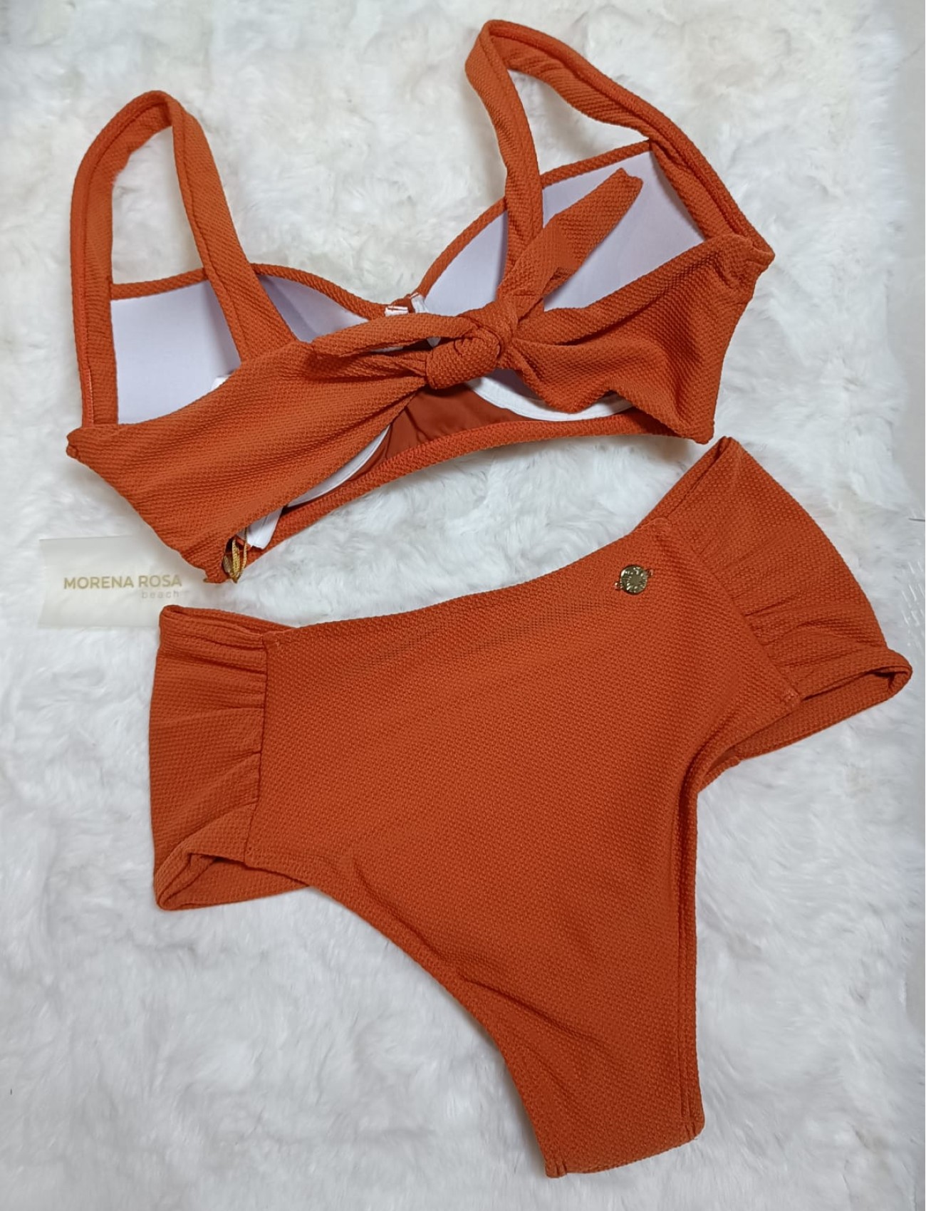 A calcinha acompanha o mesmo estilo refinado, com laterais médias e caimento anatômico que realça as curvas com naturalidade. O tom laranja intenso acrescenta energia e frescor à produção, ideal para quem gosta de looks cheios de personalidade.