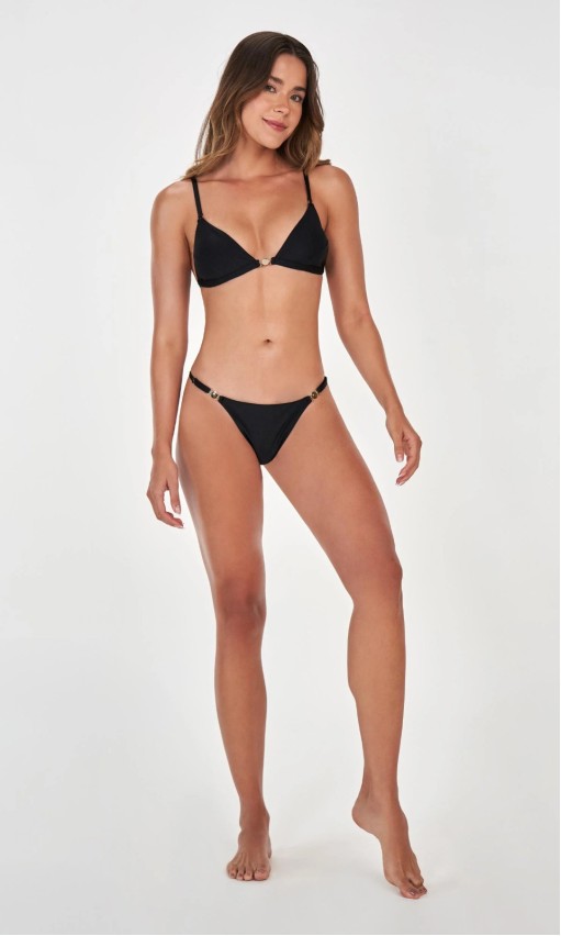O Biquíni Triângulo com Medalhinha Preto Alto Giro traz um toque clássico e elegante para os dias de sol. O top triângulo possui modelagem ajustável, com amarrações no pescoço e nas costas, proporcionando encaixe perfeito e conforto durante o uso. O detalhe da medalhinha metálica adiciona um charme especial e sofisticado ao design minimalista.