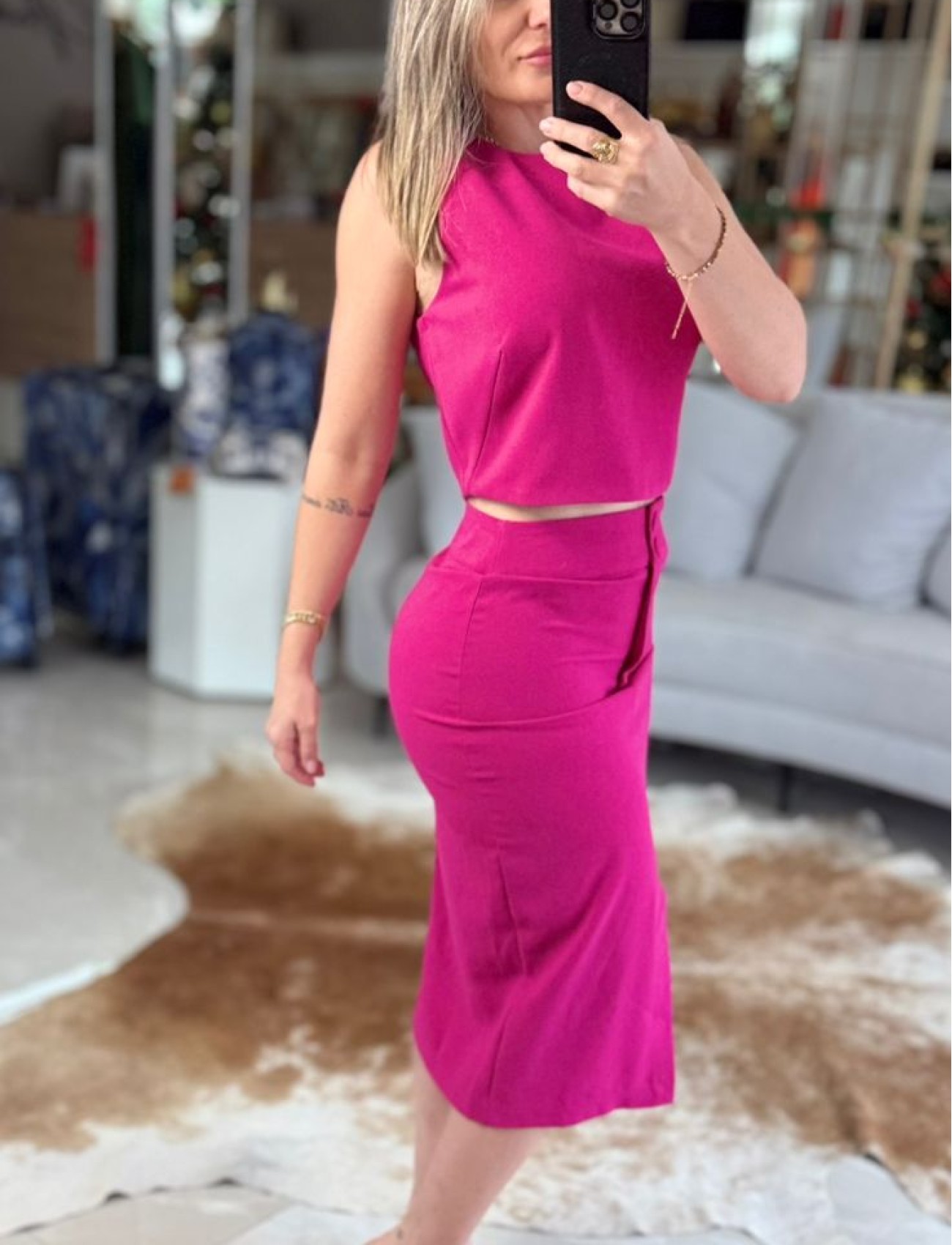 O decote redondo garante um acabamento clássico e atemporal, enquanto o zíper adiciona um toque contemporâneo ao design, trazendo praticidade e estilo. Sem mangas, a peça é perfeita para produções que vão do casual chic ao look mais urbano, dependendo das combinações.