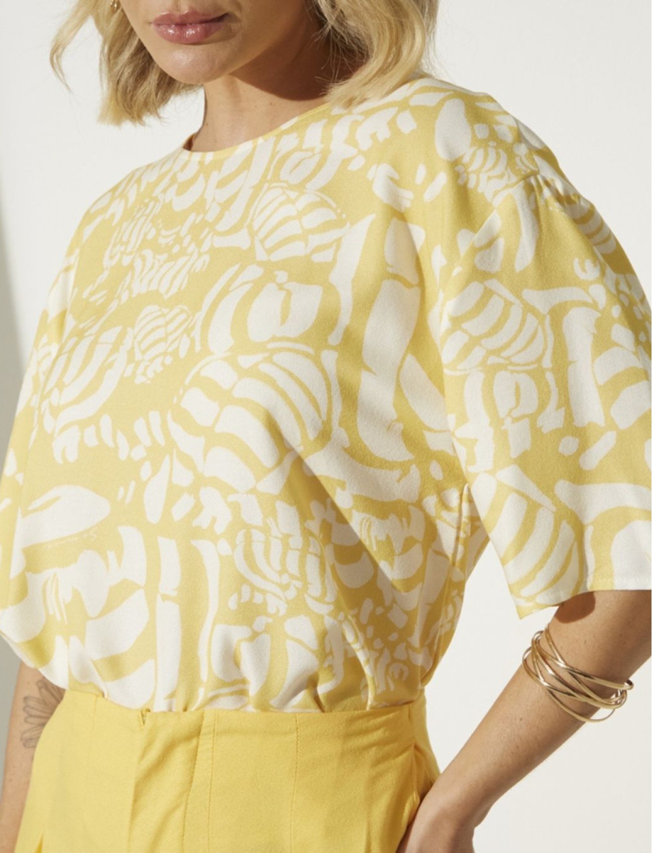 Peça possui gola redonda, estampa exclusiva verão 24, mangas 3/4, etiqueta interna centralizada no centro das costas e barra com acabamento simples.