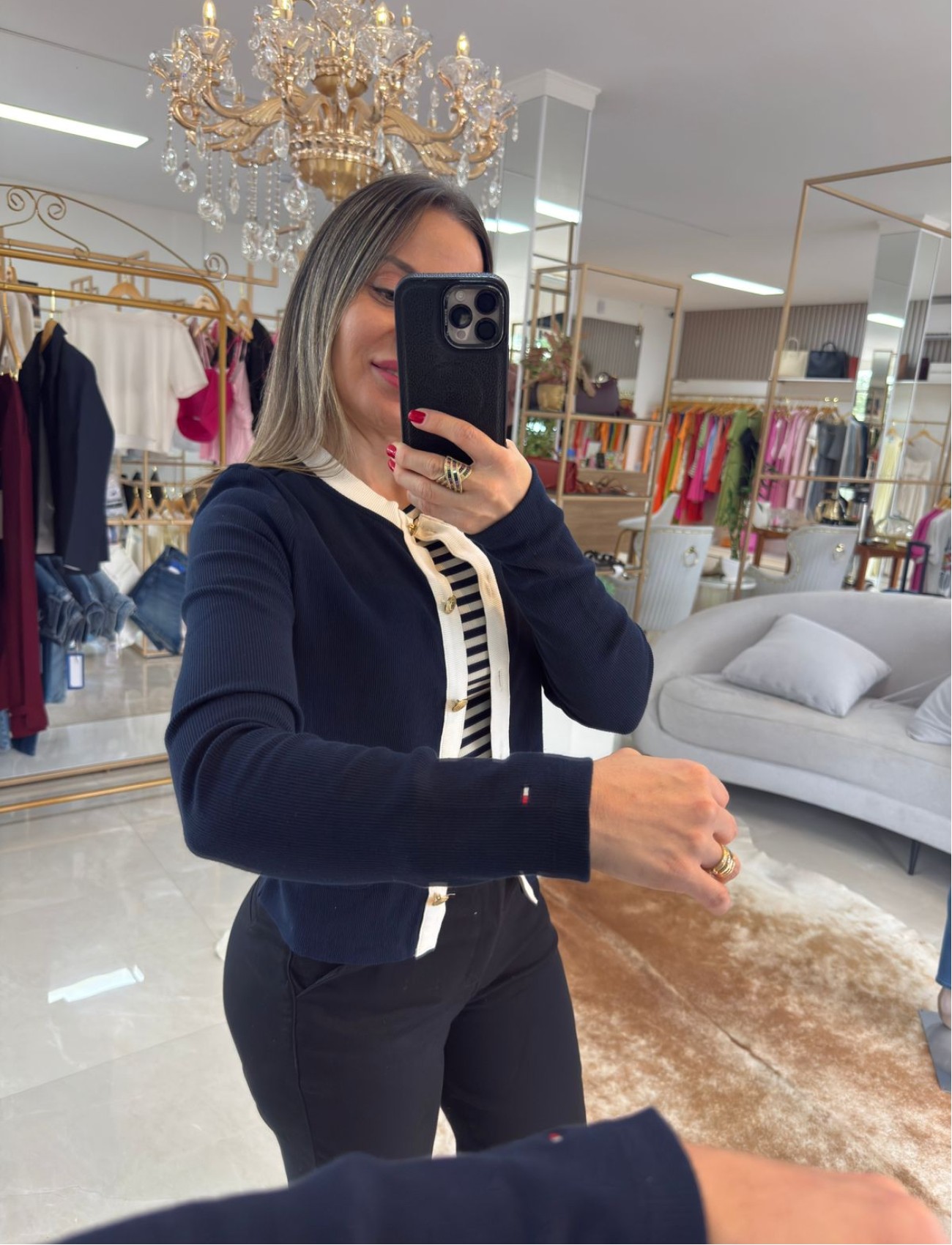 O Cardigan Lady Tommy é a definição de elegância clássica com um toque moderno. Em design sofisticado, a peça se destaca pelo contraste entre o preto e o off-white, criando um visual atemporal e refinado.