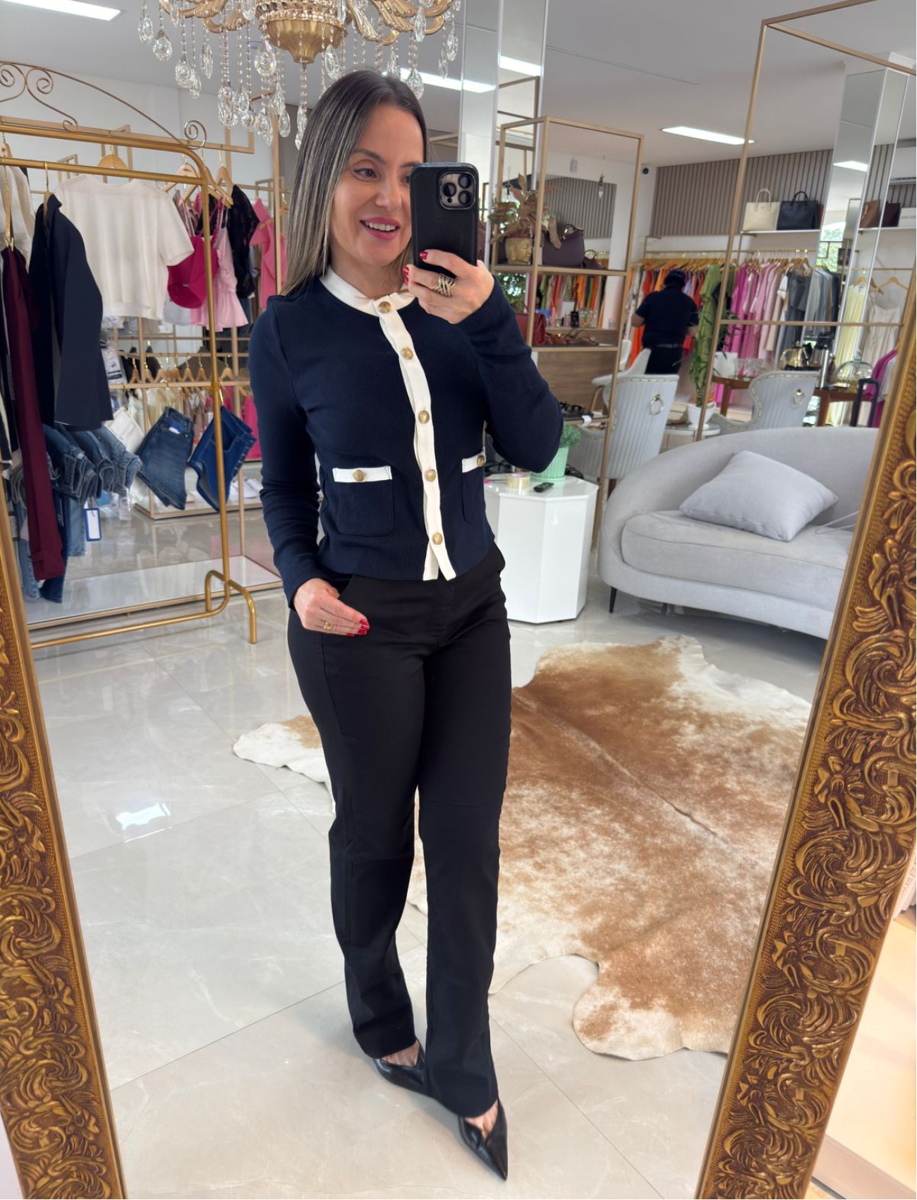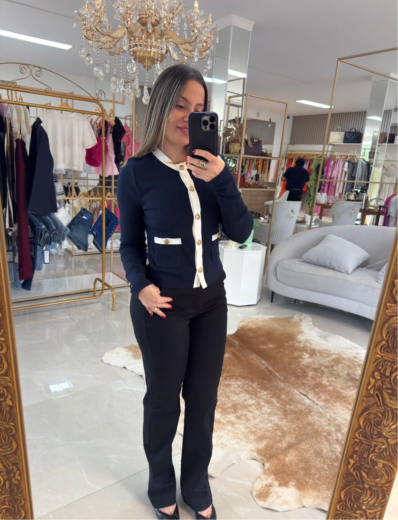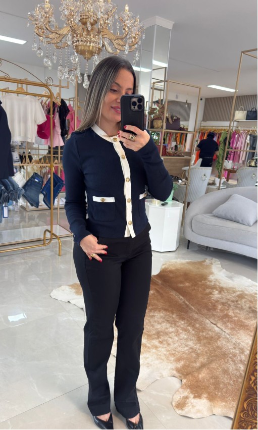 Confeccionado em malha macia e confortável, possui modelagem ajustada que valoriza a silhueta com delicadeza. O fechamento frontal com botões dourados e os detalhes contrastantes na gola, barra e bolsos trazem charme extra, remetendo ao estilo clássico com inspiração europeia.