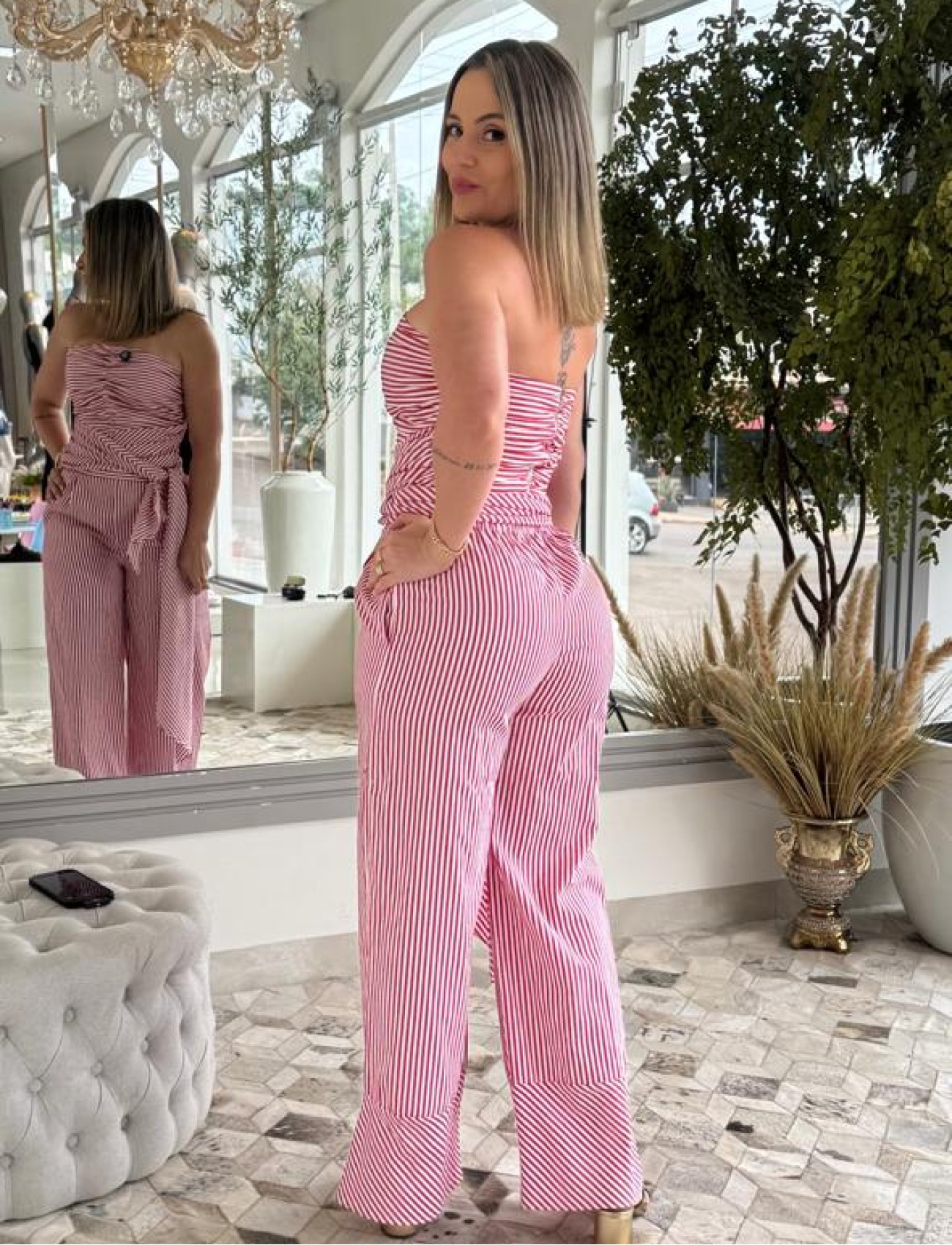 O top possui modelagem cropped, com decote reto e alças médias que proporcionam ótimo caimento e conforto. Já a calça tem cintura alta e recorte amplo, garantindo movimento fluido e um visual leve e sofisticado. Confeccionado em tecido leve e de toque macio, o conjunto é ideal para produções de verão que transitam facilmente do dia à noite.