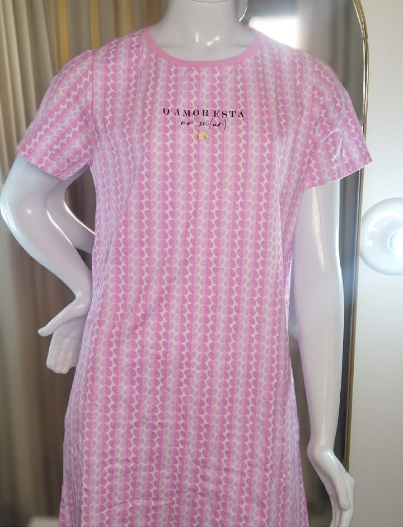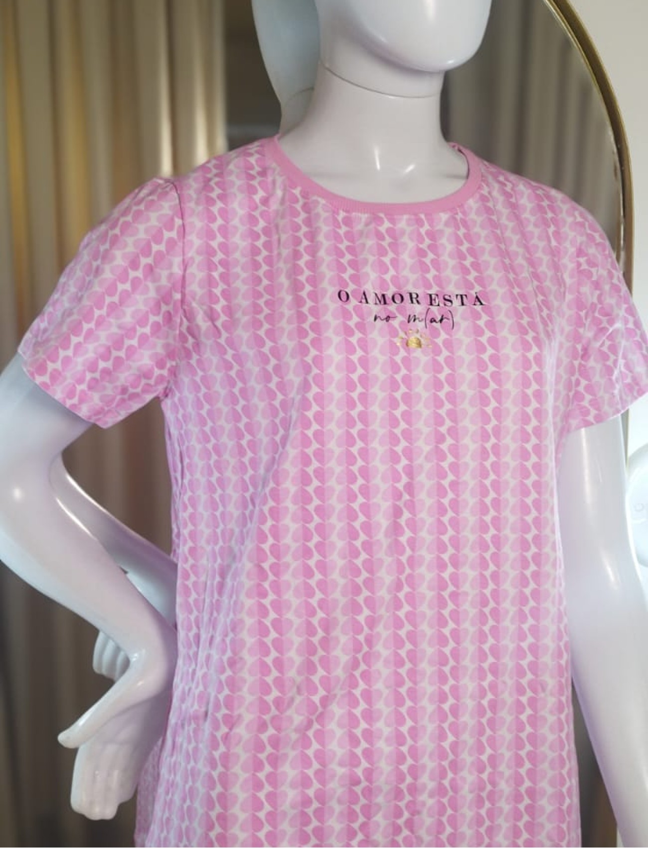 O modelo de manga curta garante frescor, enquanto a estampa “O Amor Está no Mar” traz um toque romântico e descontraído à peça. O tom rosa reforça a feminilidade e deixa a camisola ainda mais encantadora, ideal para momentos de descanso com estilo.