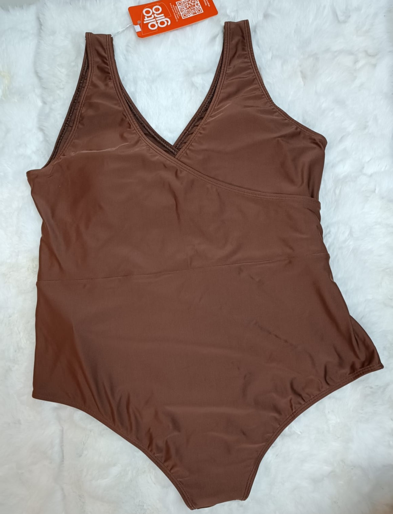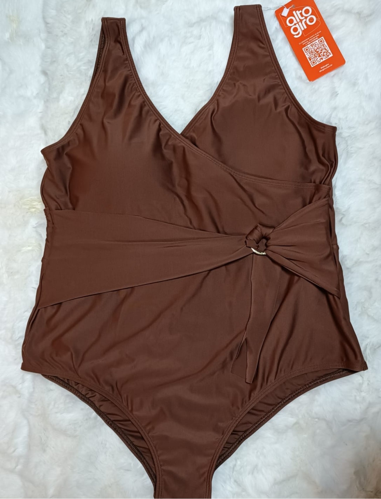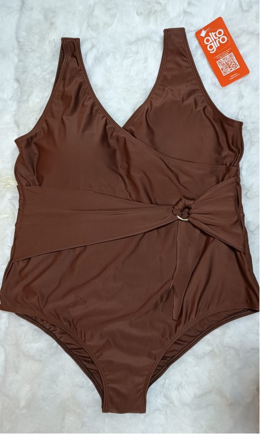O Maiô Plus Size Transpassado Com Argola Marrom Alto Giro une elegância, conforto e estilo em uma peça feita para valorizar as curvas com sofisticação. O decote transpassado realça o busto e cria um efeito visual harmonioso, enquanto a argola frontal traz um detalhe moderno e marcante ao design.