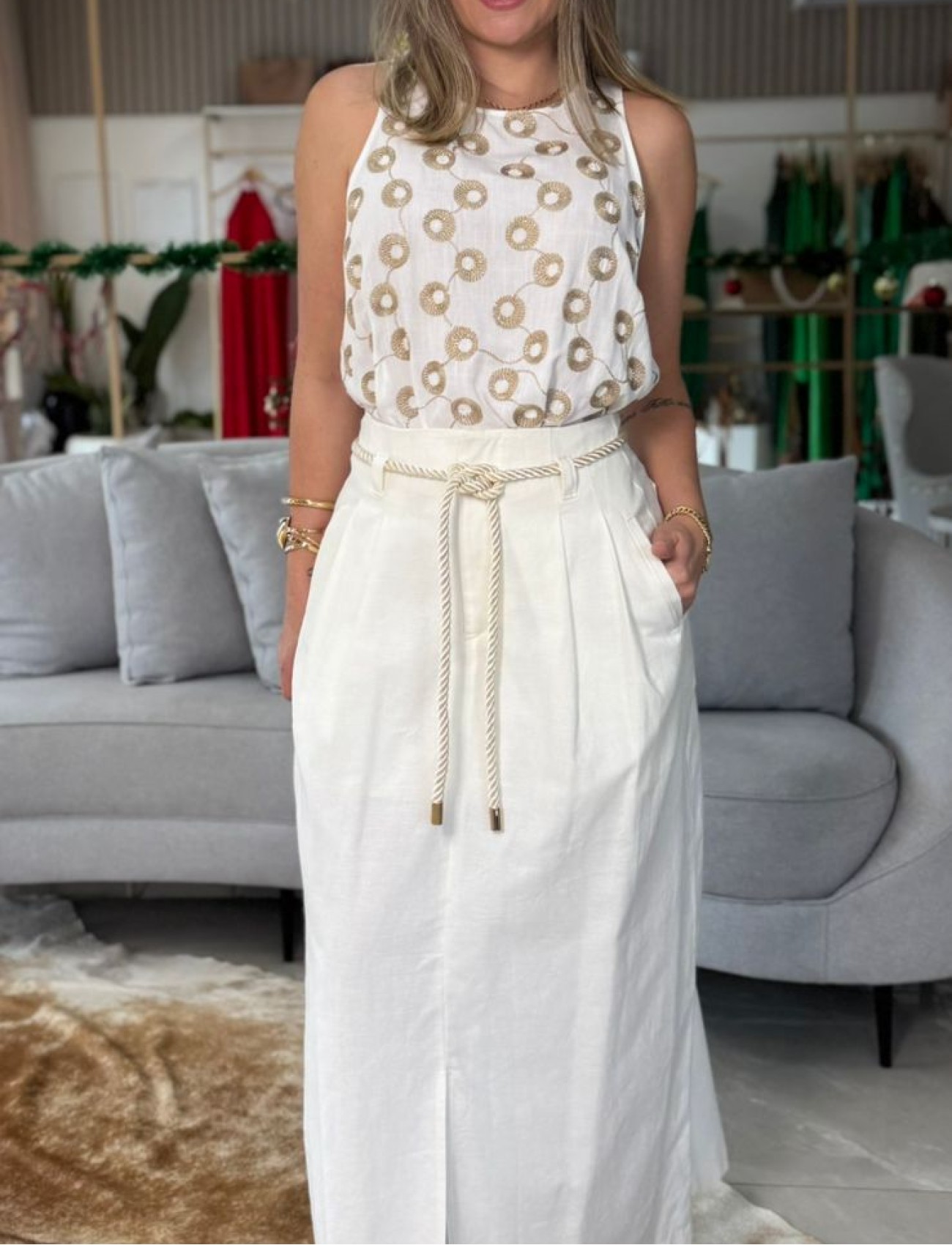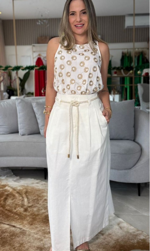 A Regata Cropped Solta Branca com Detalhes Dourados é uma peça leve e sofisticada, perfeita para composições elegantes com toque moderno. Confeccionada em tecido fluido, ela oferece caimento soltinho e confortável, ideal para o dia a dia ou produções mais refinadas.