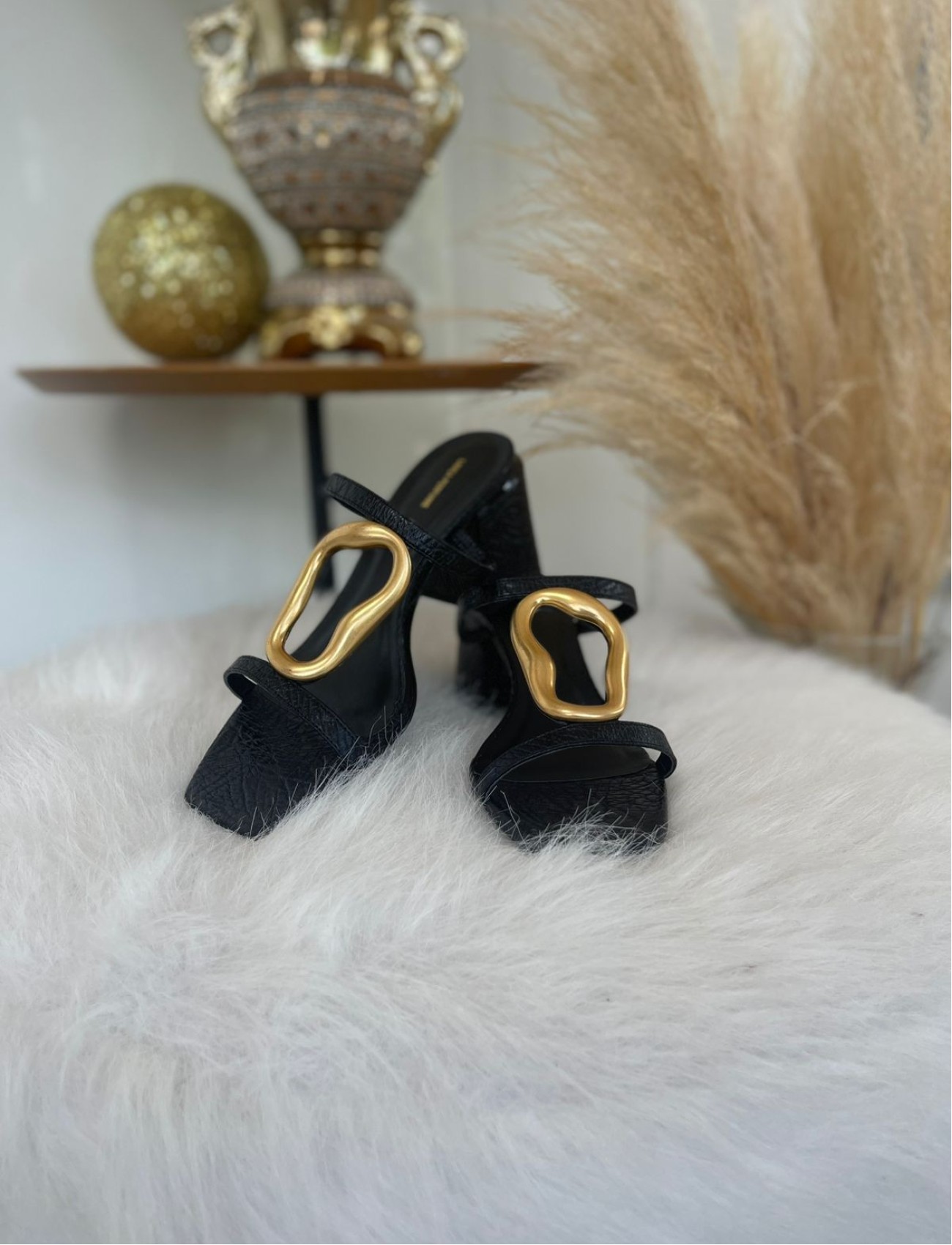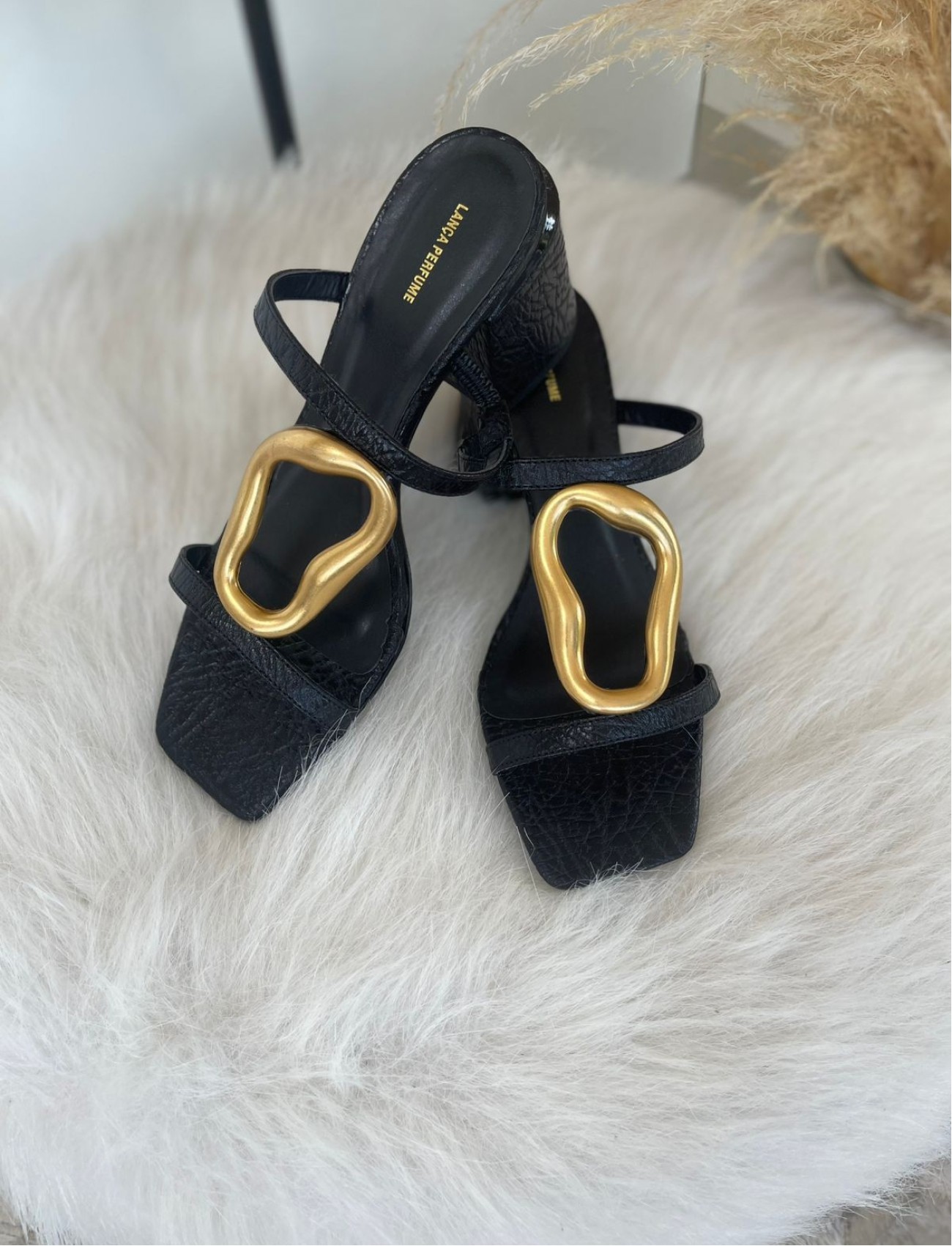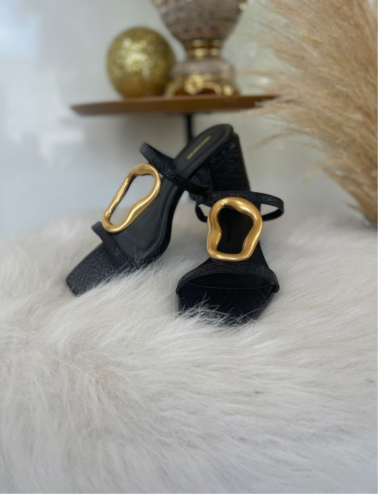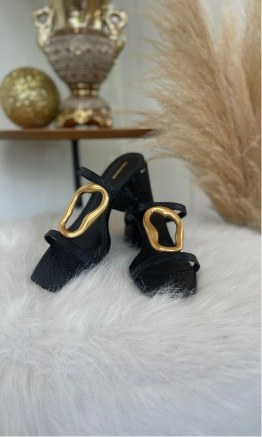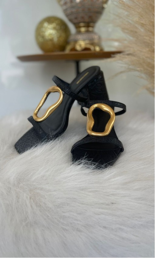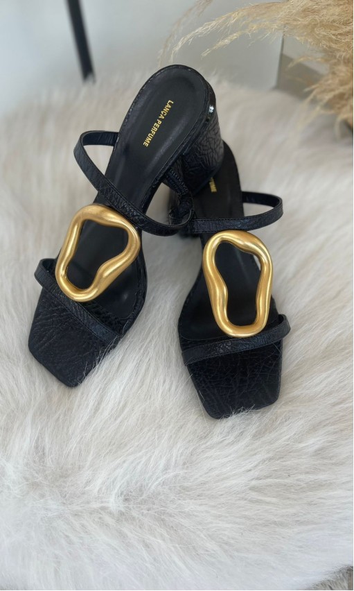 A sandália preta da Lança Perfume com detalhe em metal orgânico é a definição de sofisticação moderna. O design minimalista é elevado pelo metal dourado com formas fluídas, que trazem um toque de arte e contemporaneidade à peça.