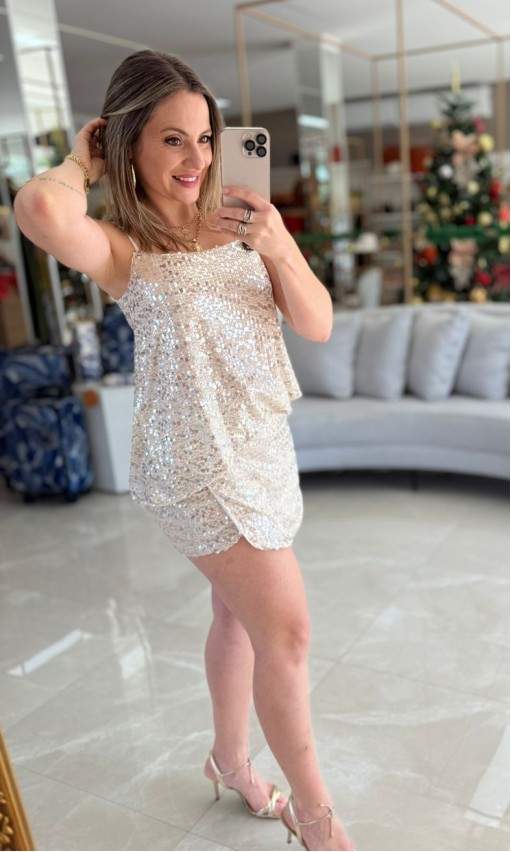 O destaque da peça fica por conta da aplicação de paetês, que adiciona charme e um toque glam ao look, sem perder a elegância. A modelagem short saia une praticidade e feminilidade, enquanto o comprimento curto valoriza a silhueta de forma leve e atual.