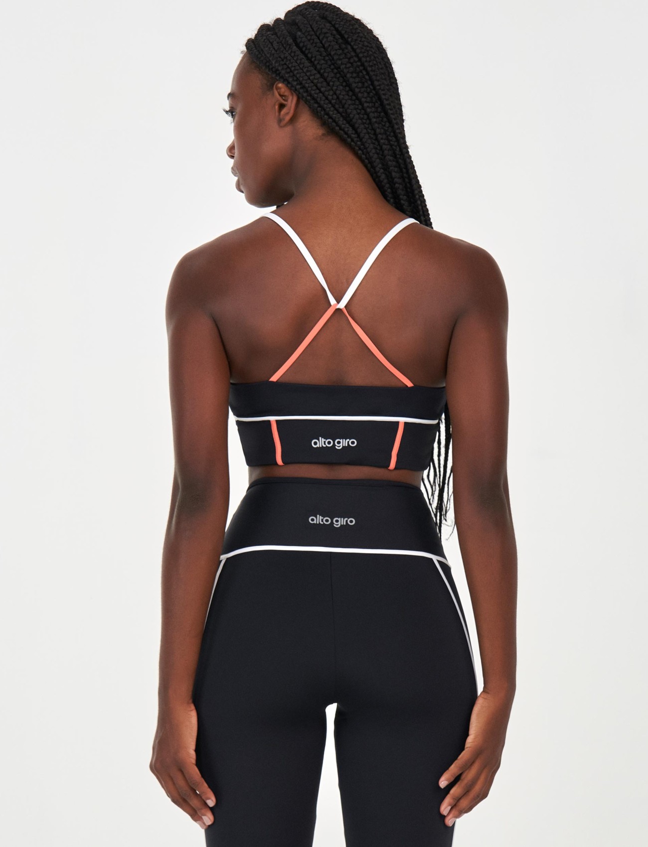 O recorte anatômico abaixo do busto valoriza seu visual, enquanto os galões contrastantes em branco e coral sobre fundo preto criam um estilo feminino e fashion.