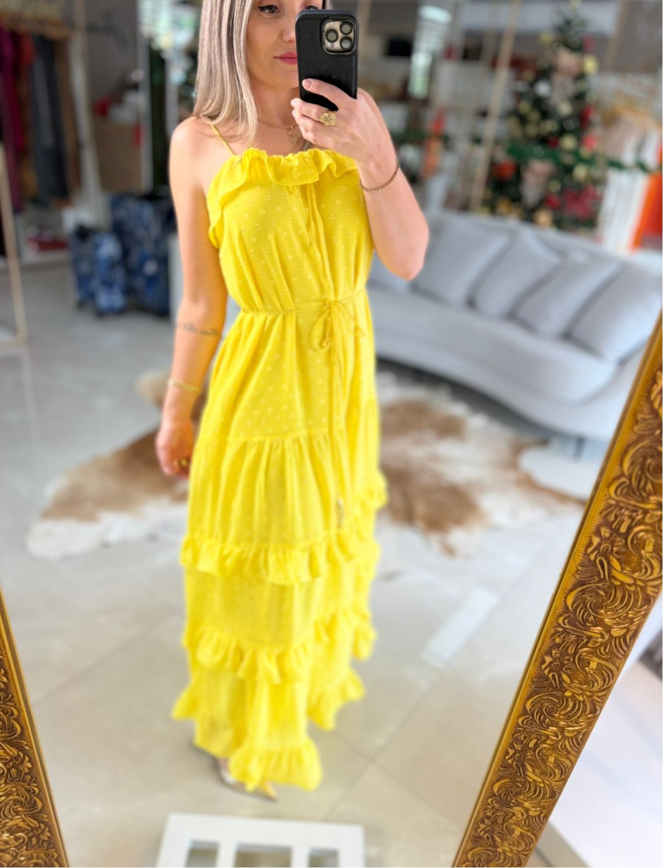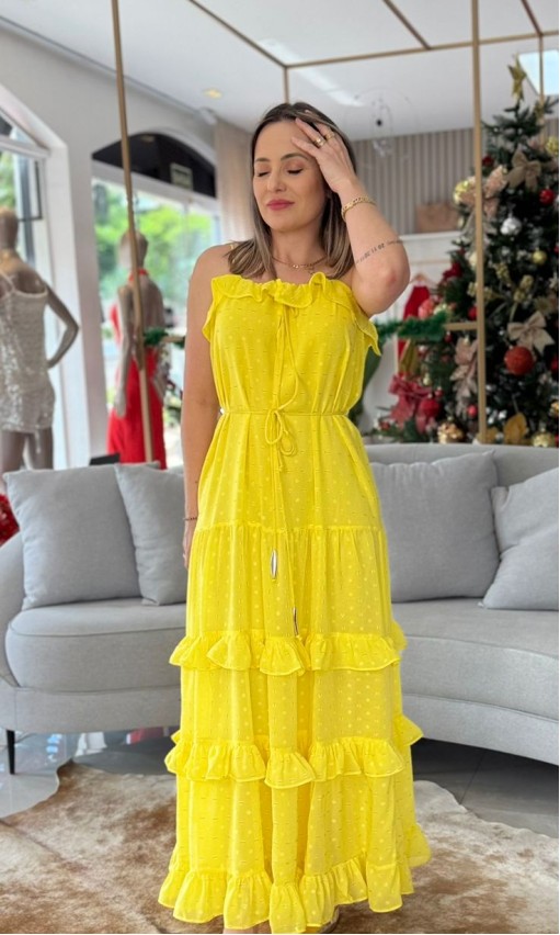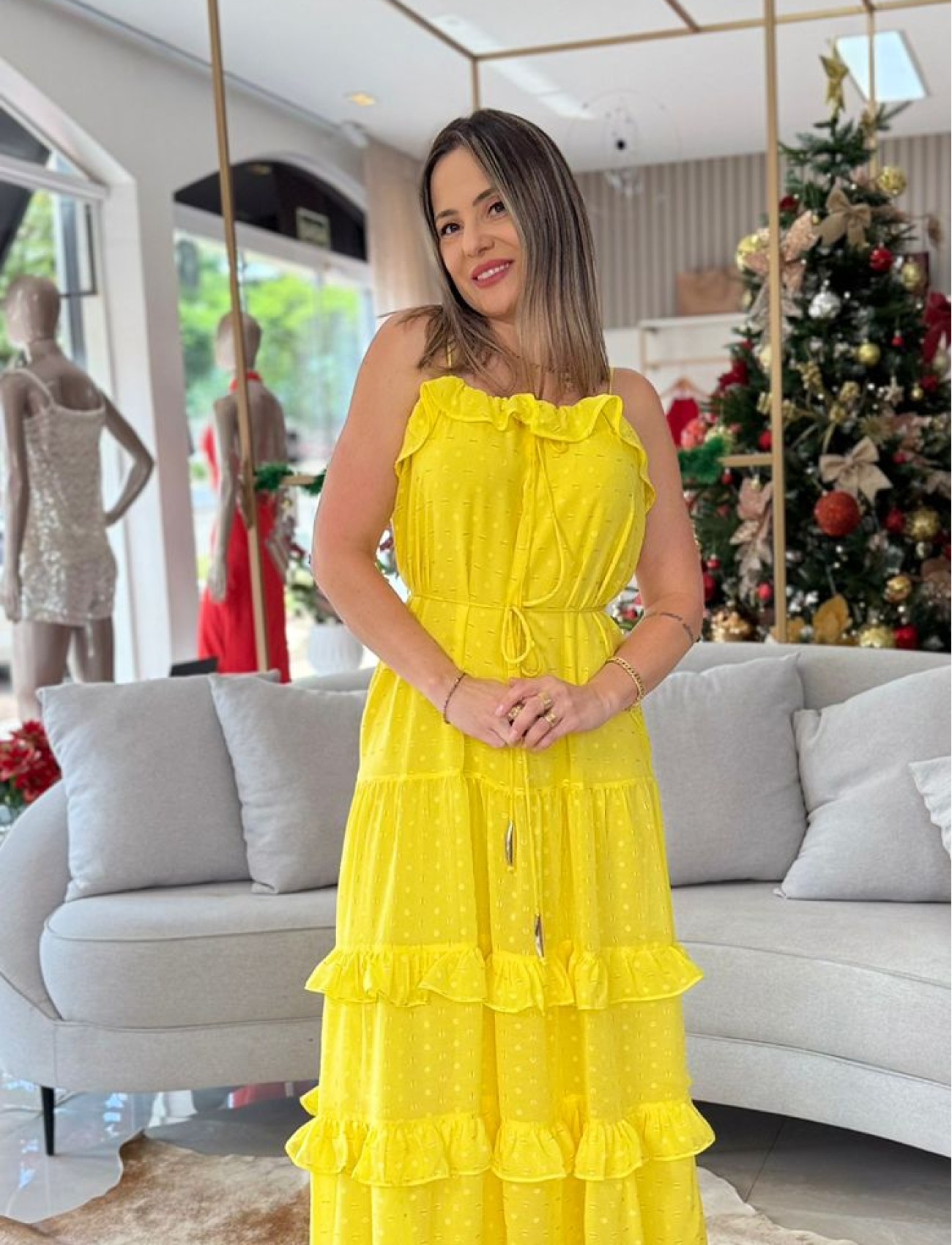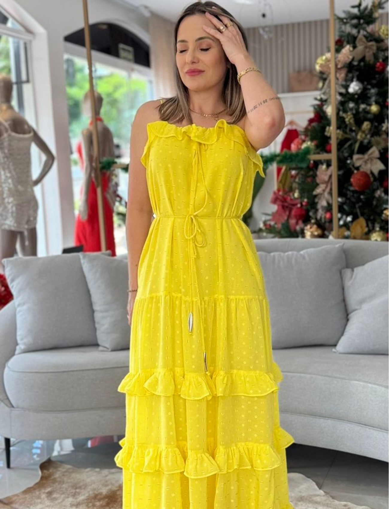 O destaque fica por conta dos babados aplicados na saia, que criam um visual romântico e cheio de movimento, enquanto o decote delicado complementa a proposta com charme. O tom amarelo traz frescor e energia, ideal para composições marcantes em dias ensolarados.