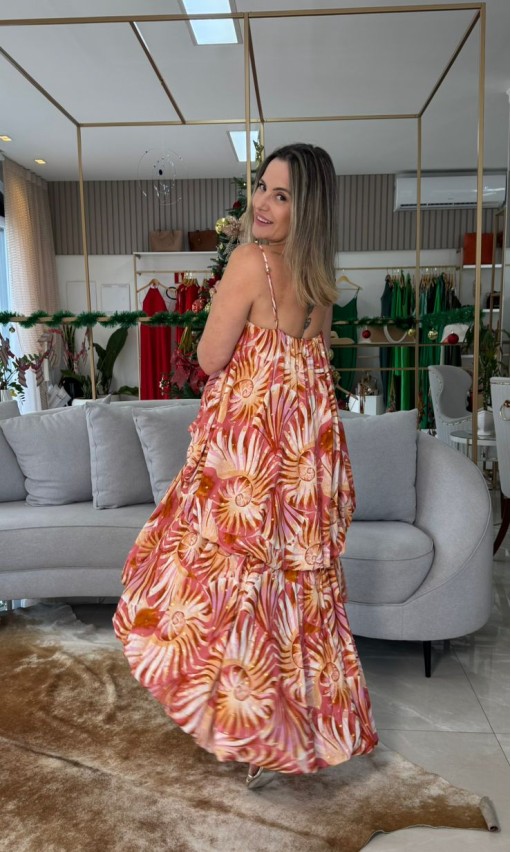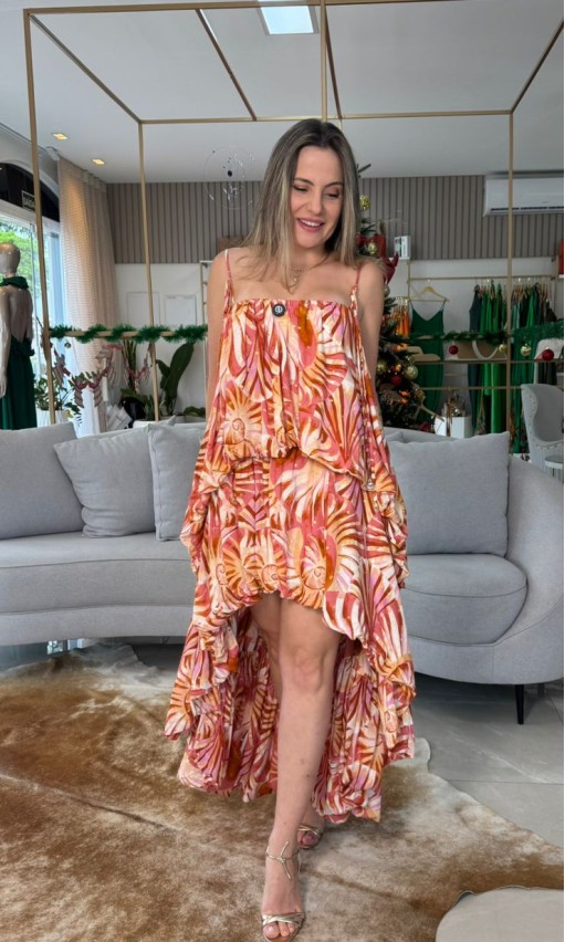 A modelagem balonê traz volume e estilo, enquanto o comprimento mullet — mais curto na frente e alongado atrás — cria um efeito dinâmico e contemporâneo. A estampa Mar de Concha, exclusiva da Farm, adiciona charme e identidade à peça, tornando o vestido ideal para produções criativas e cheias de atitude.