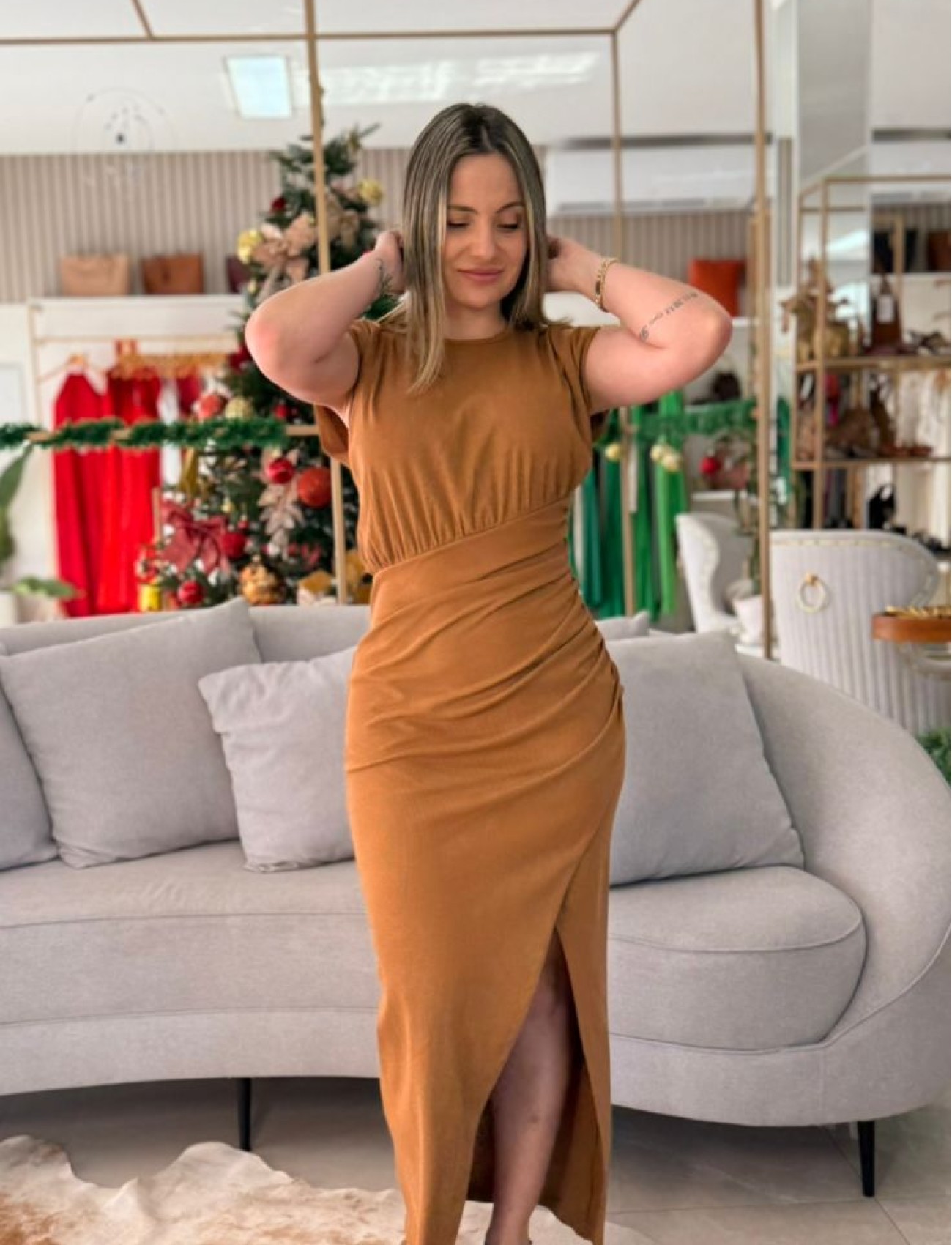 O Vestido Canelado Marrom Evermore Sommer é a peça perfeita para quem busca praticidade com um toque moderno e elegante. Confeccionado em malha canelada macia e com excelente elasticidade, proporciona conforto absoluto e um caimento ajustado que valoriza a silhueta de forma natural.