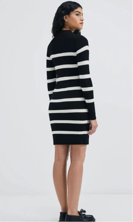 O vestido apresenta modelagem acinturada, comprimento curto, mangas longas com punho, gola alta, não possui bojo, listrado nas cores preto e off white.