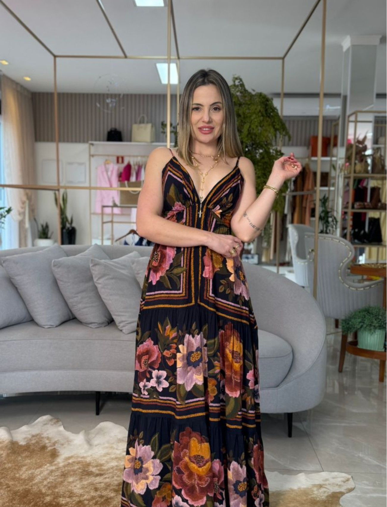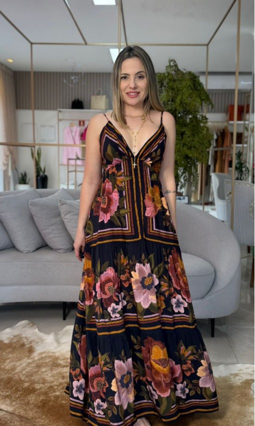 Elegante e cheio de frescor, o Vestido Estampado Floral Cleo Preto Farm combina a sofisticação da cor preta com a delicadeza da estampa floral exclusiva da marca. Confeccionado em tecido leve, oferece caimento fluido que valoriza o movimento e garante conforto ao vestir. A modelagem versátil permite composições que transitam do dia para a noite, sempre com o charme autêntico da Farm.