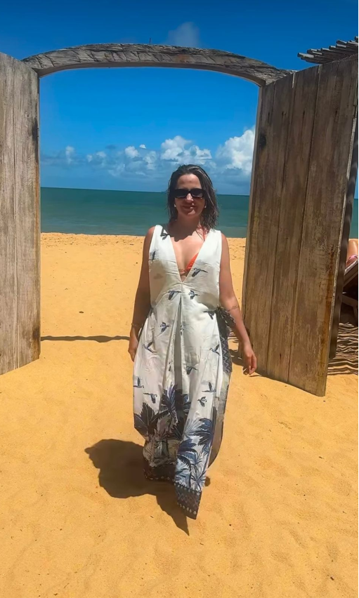 O vestido azul é confeccionado em tecido leve sem elasticidade. A peça solta ao corpo, possui decote em V, alças largas, pregas frontais, aberturas laterais com faixas estendidas com mix de estampas, recorte vazado posterior, recorte posterior, mix de estampas figuravas em tons de azul, comprimento longo, forro e fechamento lateral por amarração.