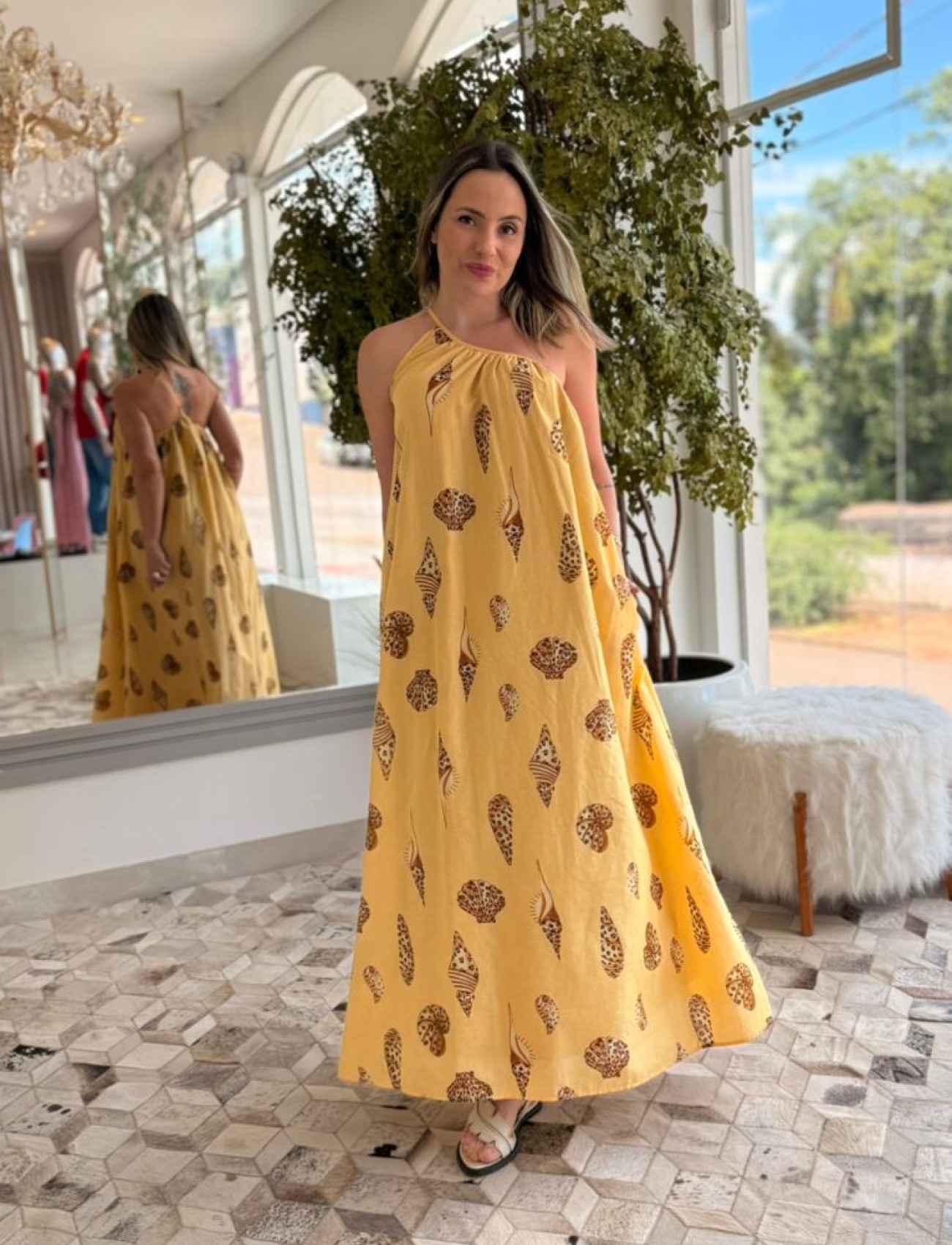 Com modelagem longa e fluida, ele proporciona caimento leve e elegante, ideal para acompanhar os movimentos com charme. Perfeito para dias de verão, viagens ou eventos ao ar livre com um toque de poesia e frescor.