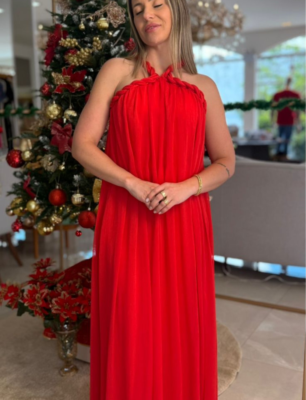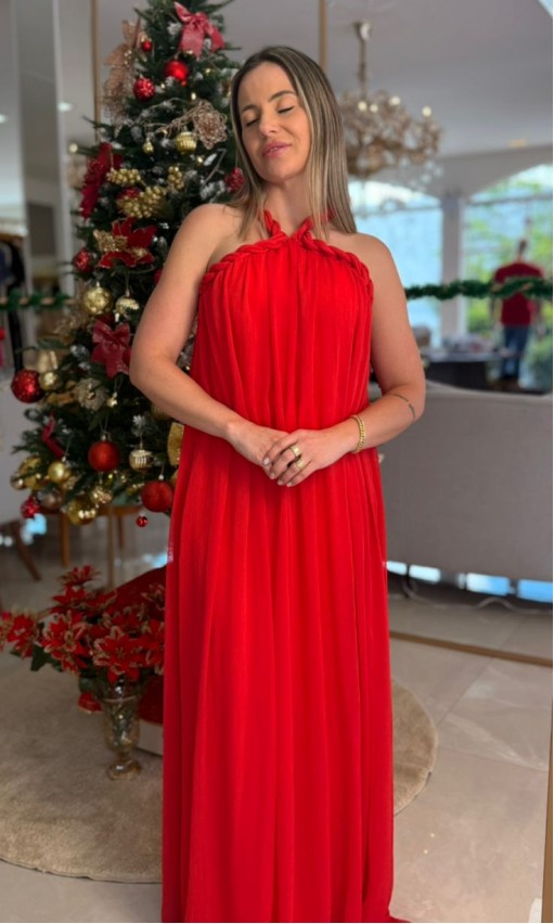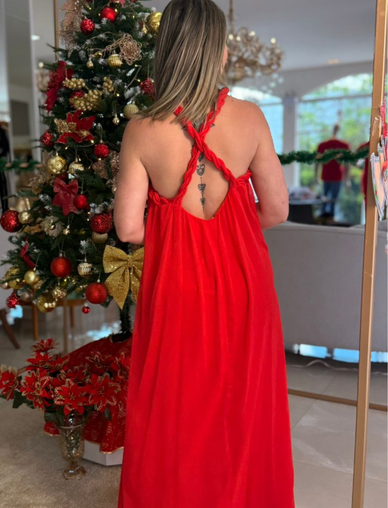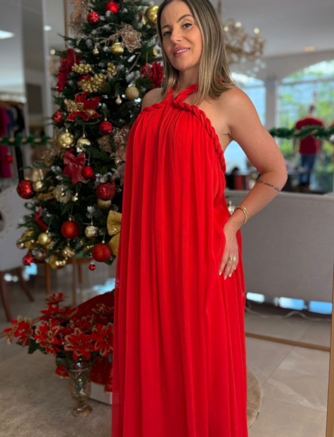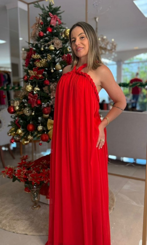 O tom vermelho vibrante destaca a peça, trazendo personalidade e impacto ao look. A modelagem midi ampla garante liberdade e frescor, sendo perfeita para dias quentes, eventos casuais e produções urbanas sofisticadas.