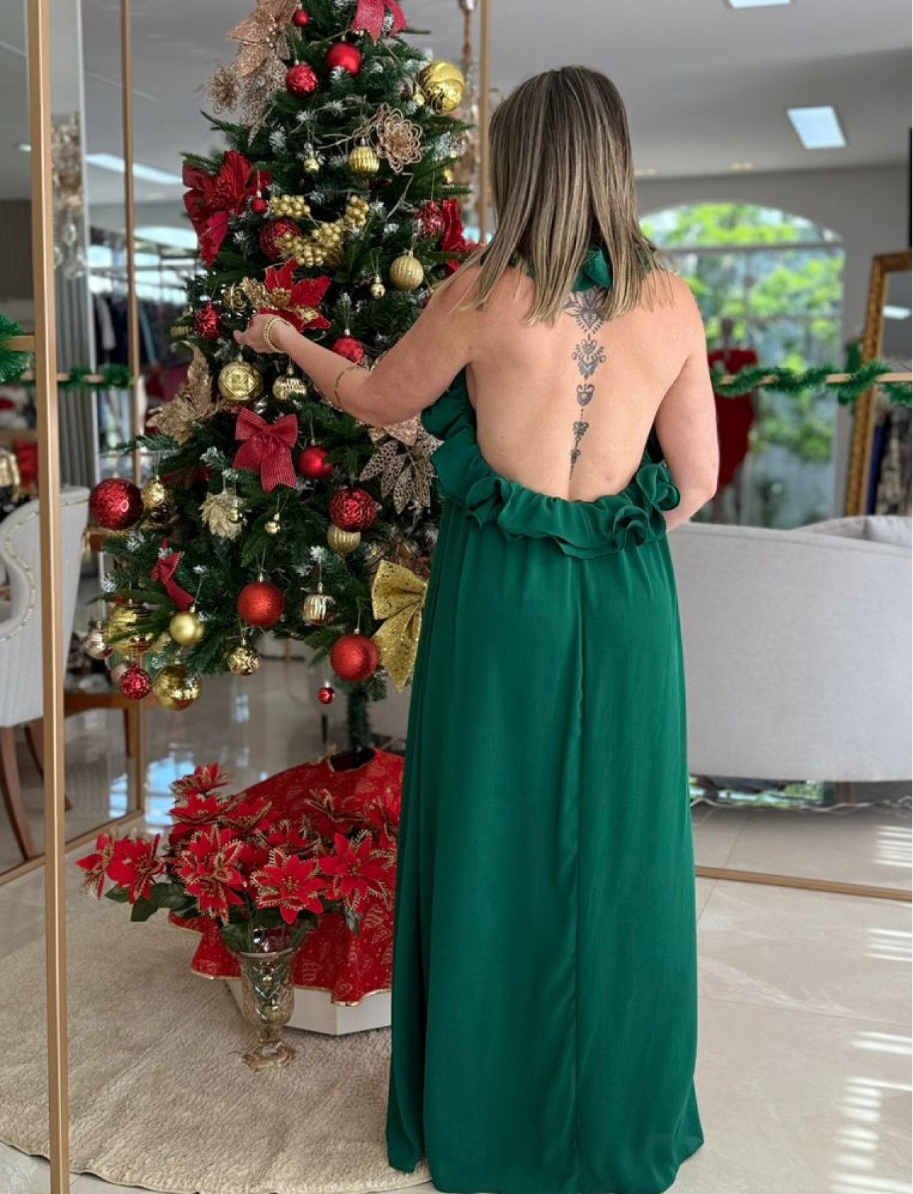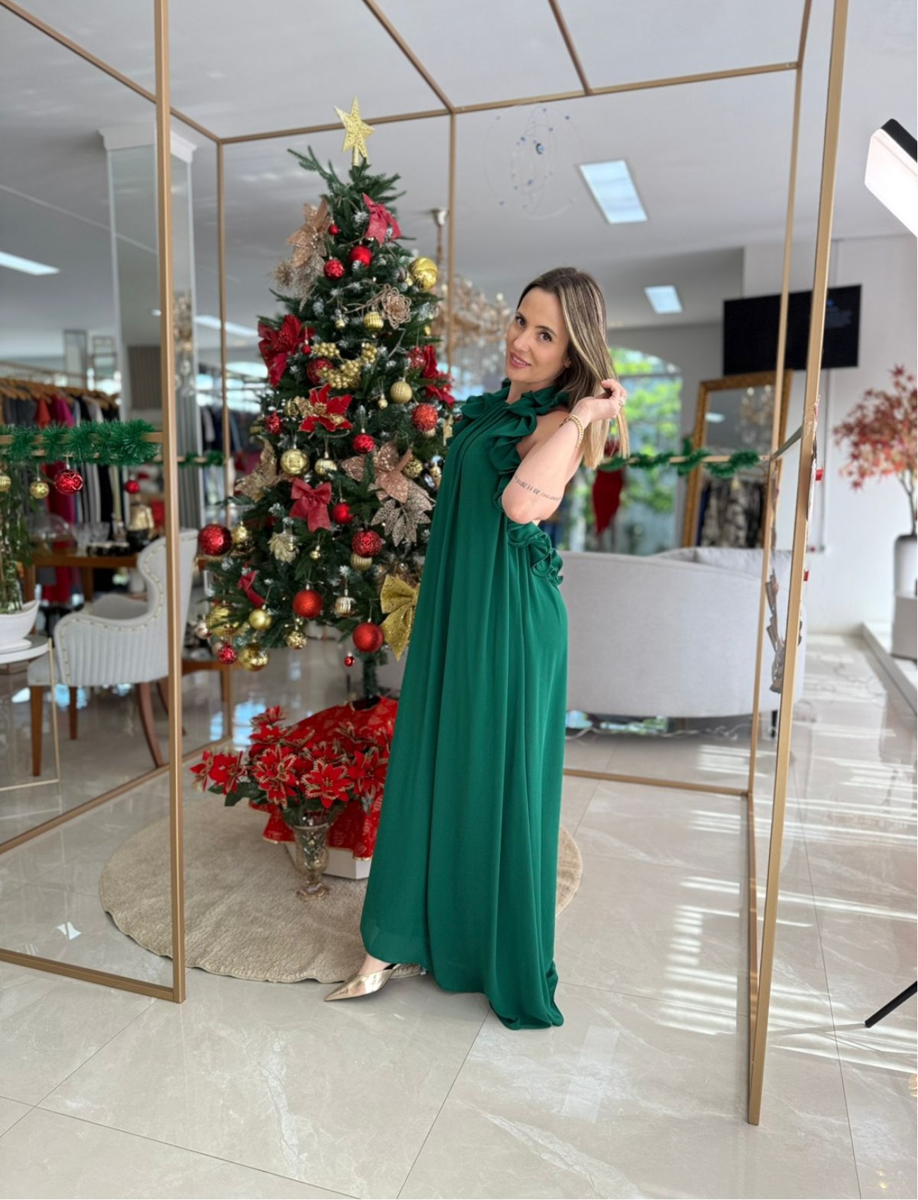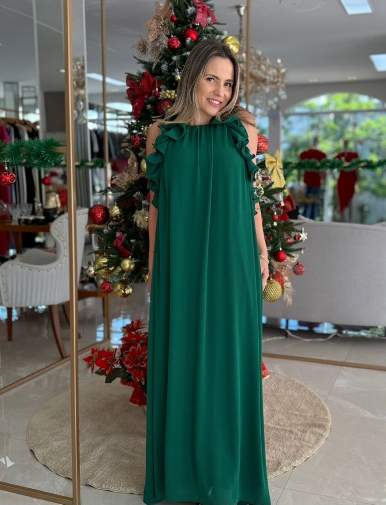 O Vestido Midi Fluido com Babados da Carlota Costa, agora na tonalidade verde, traz um toque extra de frescor e elegância ao visual. O tom verde — sofisticado e atual — realça a leveza da peça e destaca sua proposta delicada e feminina.
