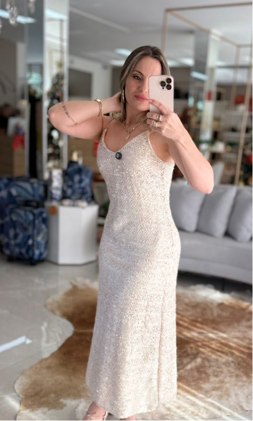 A modelagem longa alonga a silhueta e traz imponência ao look, enquanto o tom bege equilibra o brilho com sofisticação e versatilidade. O design inspirado no estilo gipsy adiciona charme e personalidade, tornando a peça perfeita para festas, eventos noturnos e produções glamourosas.