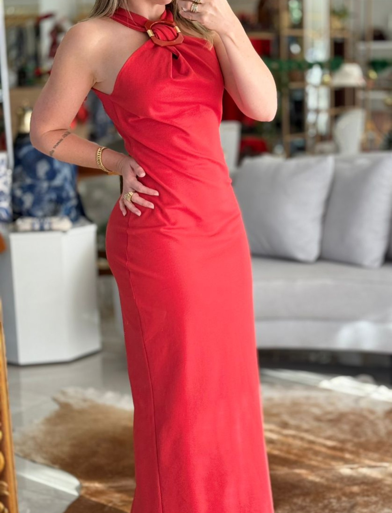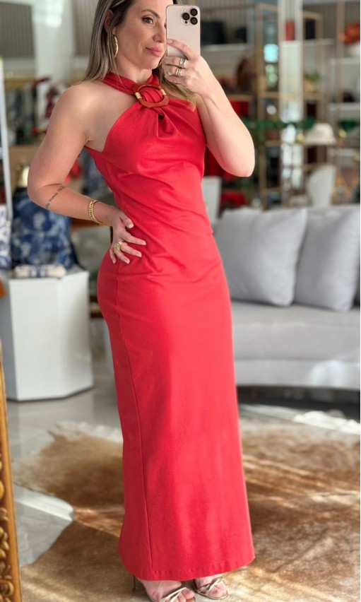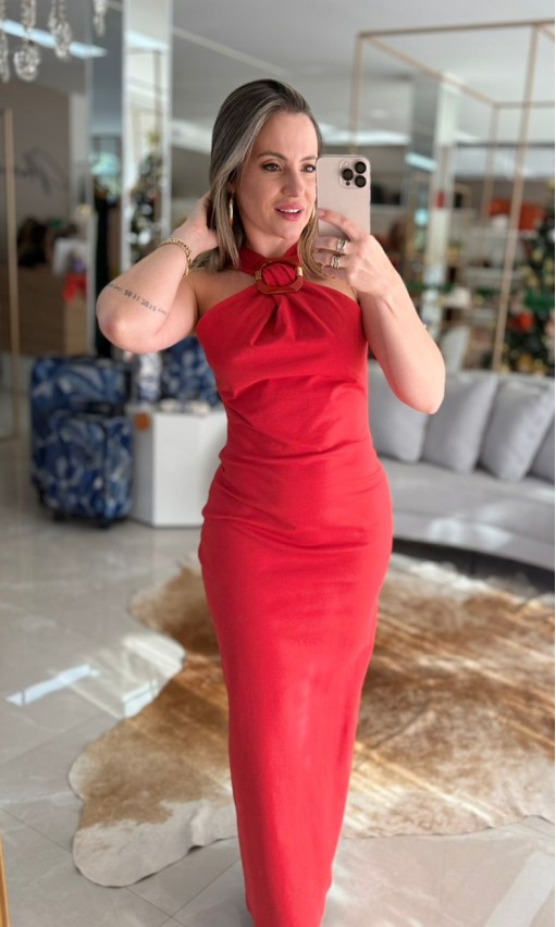 O vermelho vibrante realça ainda mais a elegância deste vestido super midi, que combina sensualidade e sofisticação em uma peça só. Sem mangas e com decote discreto, ele valoriza a silhueta com sua modelagem ajustada ao corpo.