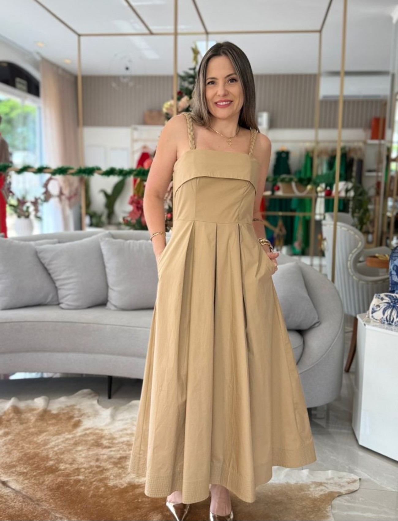 O Vestido Tricoline Alça Trançada Carlota Costa é a escolha ideal para um visual elegante com leve toque artesanal. Confeccionado em tricoline encorpado e de excelente caimento, ele une estrutura e suavidade, garantindo um look sofisticado para diversas ocasiões.