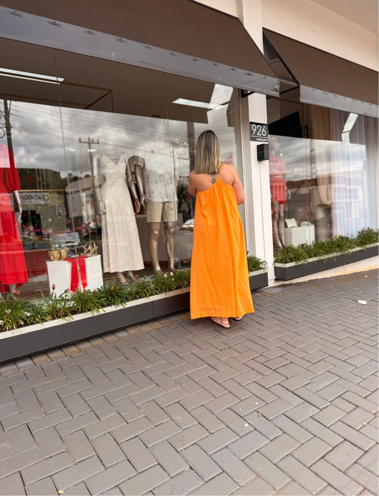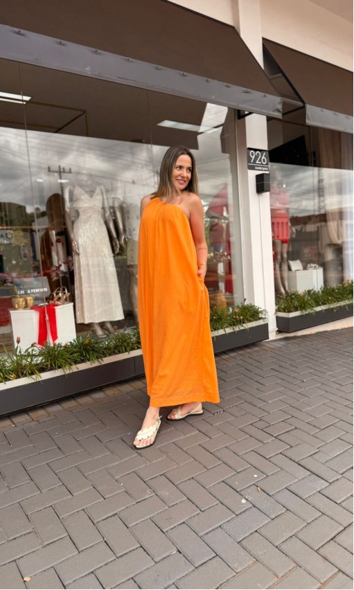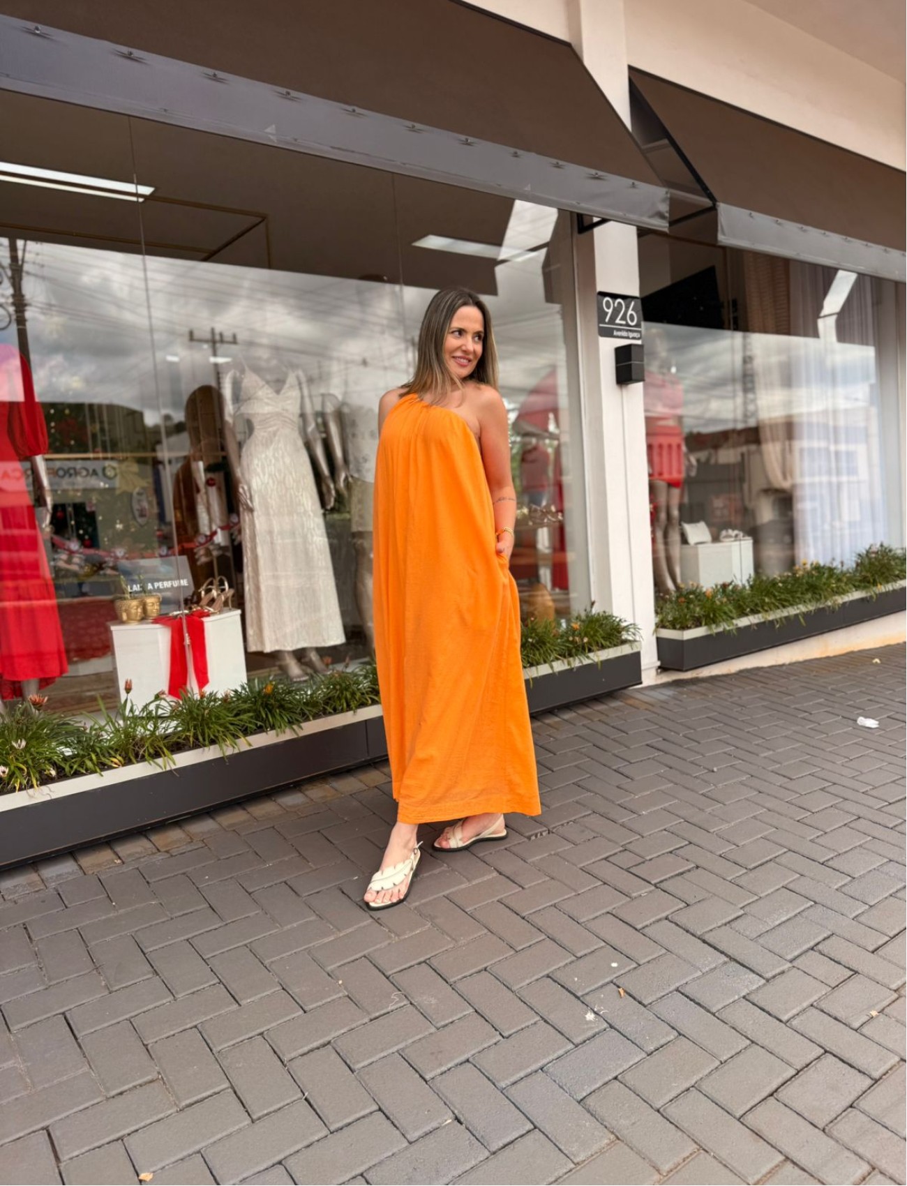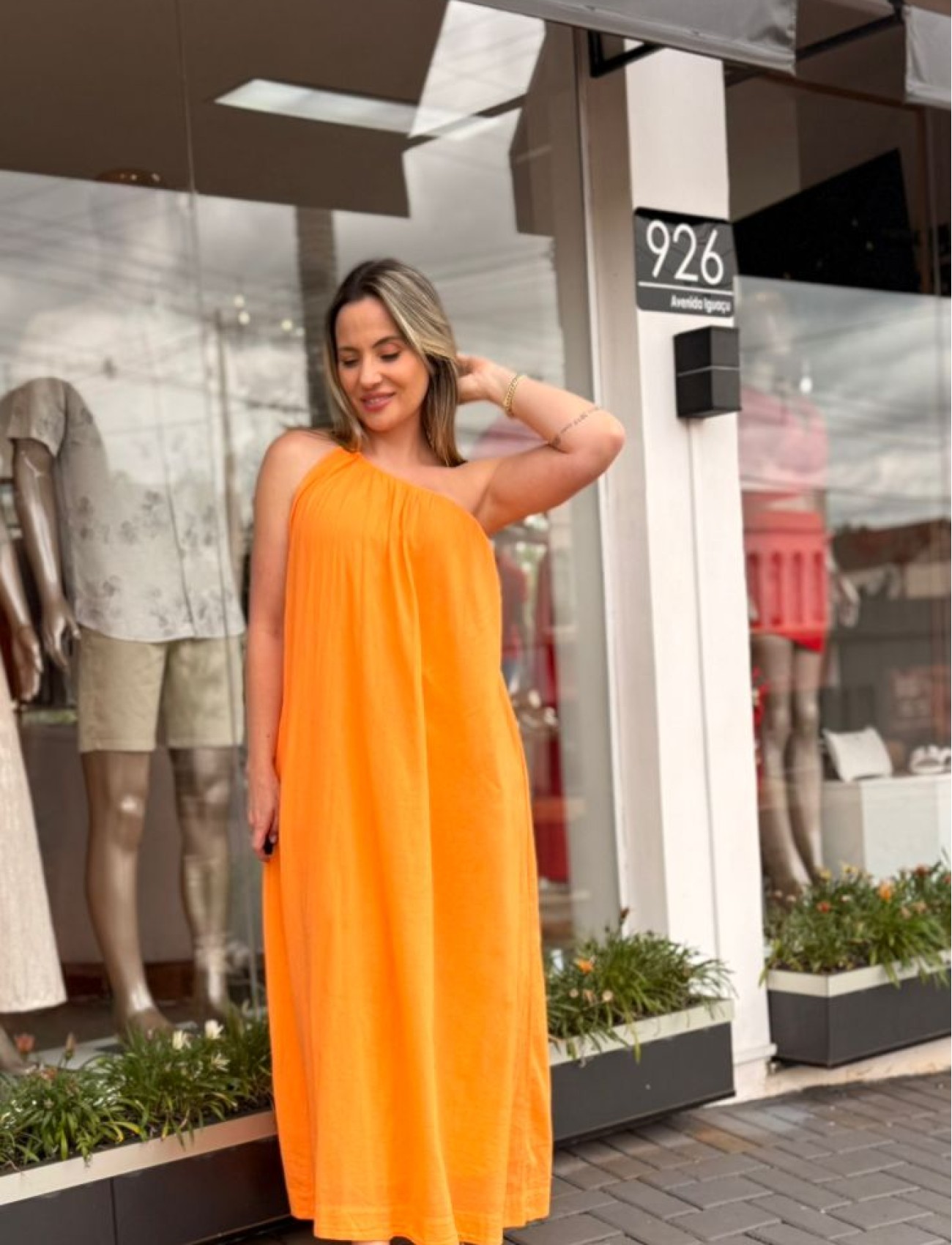 A cor laranja intensa traduz a energia do verão, enquanto o design de um ombro só adiciona um charme contemporâneo à produção. Ideal para dias ensolarados, festas tropicais ou momentos que pedem autenticidade e estilo.